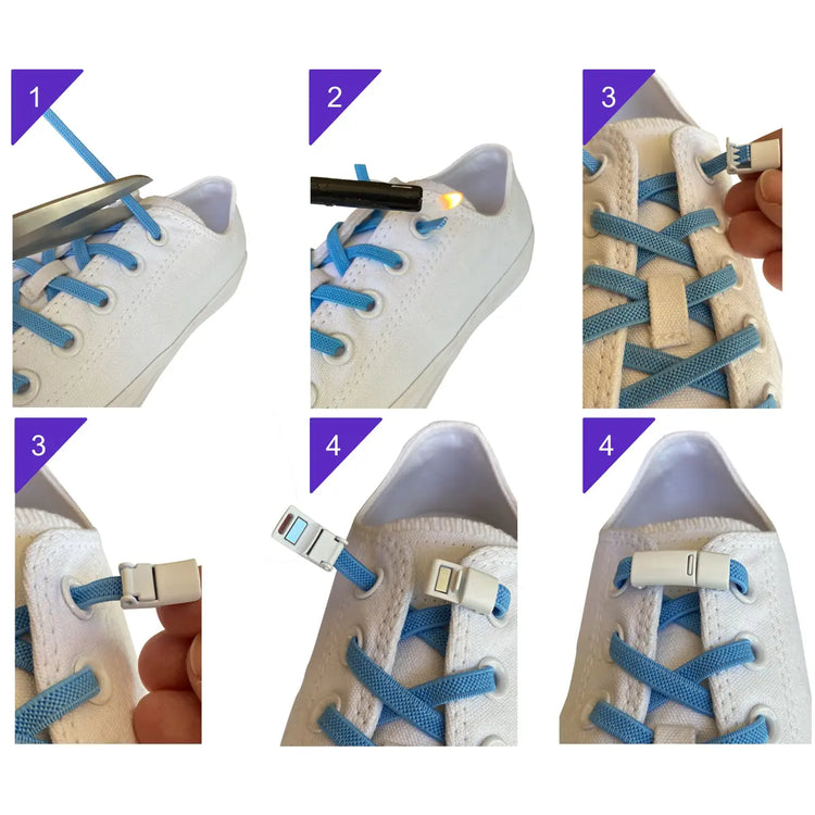 - Längenjustierung und Zuschnitt: Nach dem Einziehen der elastischen Schnürsenkel in deine Schuhe, überprüfe, ob sie sicher und komfortabel sitzen. Kürze die Schnürsenkel entsprechend, und stelle dabei sicher, dass ausreichend Länge für die Magnetverschlüsse übrig bleibt. Lasse die Schuhe an, um sicherzugehen, dass du nicht zu viel oder zu wenig abschneidest.